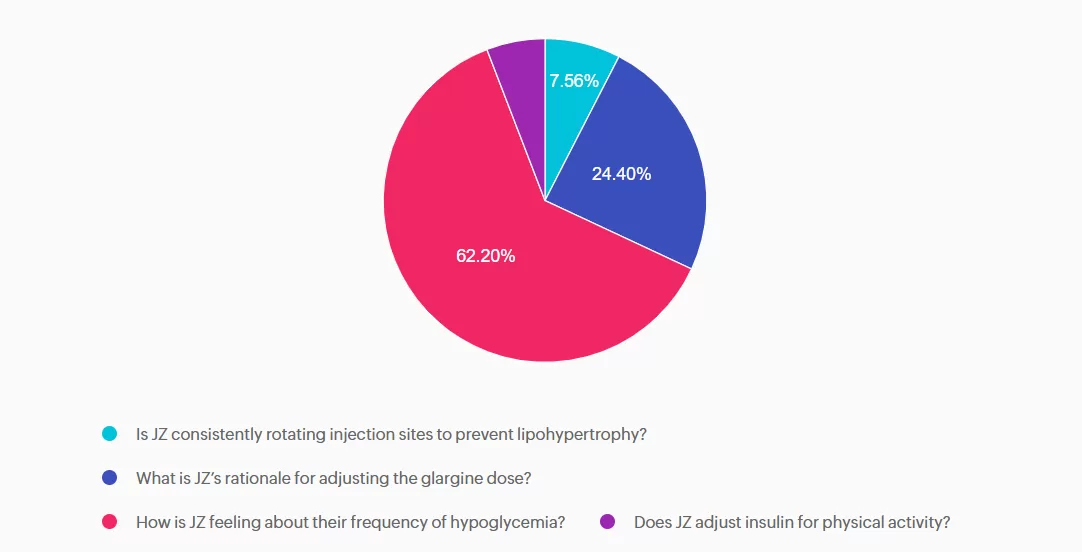 Answer D is incorrect: 5.84% chose this answer, “Does JZ adjust insulin for physical activity?” Adjusting insulin for exercise is essential for self-management, yet the first priority is identifying whether dangerous lows are occurring.