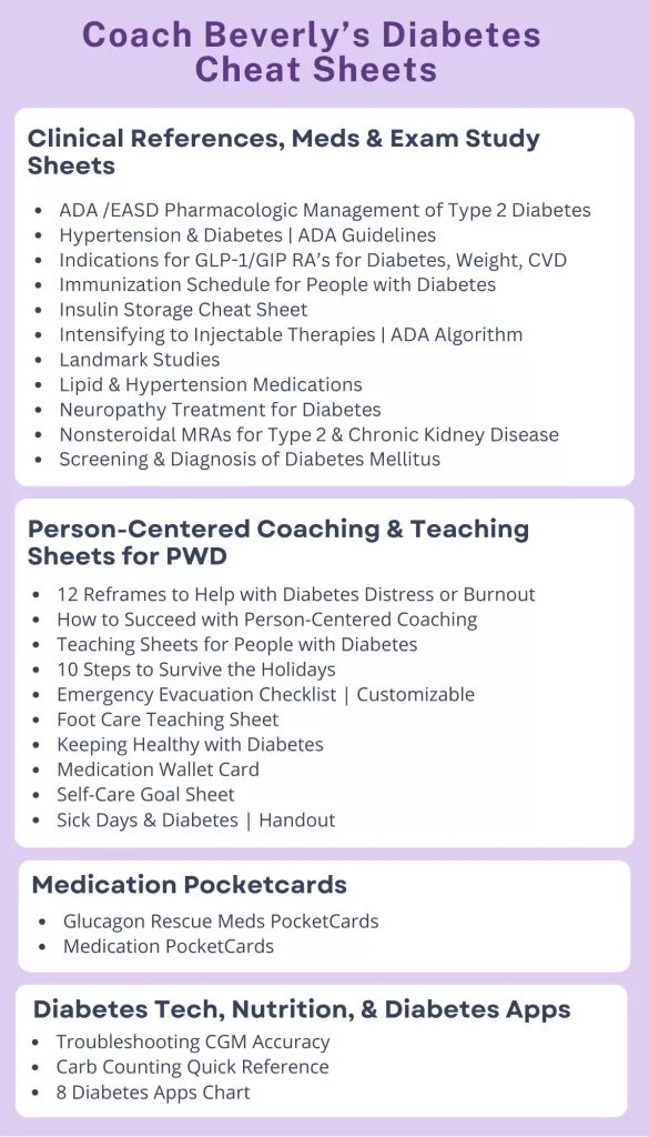 You can download these free clinical and teaching cheat sheets directly from our website or through the CDCES Coach App. To make your life easier, we’ve reorganized everything by category and alphabetically, so you can quickly find exactly what you need—right when you need it.